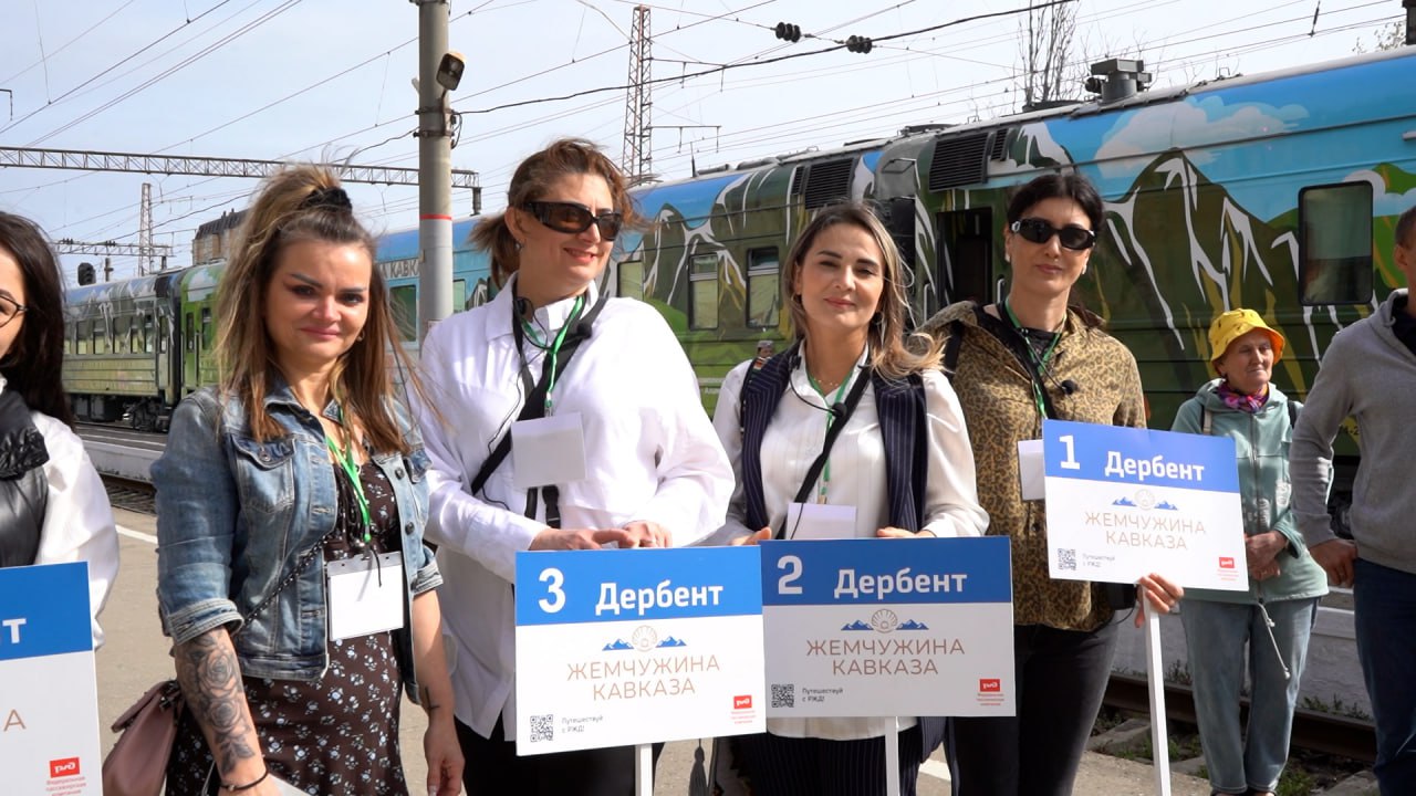1 мая на железнодорожную станцию "Дербент" прибыл круизный туристический поезд "Жемчужина Кавказа", следующий по маршруту "Москва-Майкоп-Владикавказ-Грозный-Дербент-Нальчик-Москва. В этот день прямо на перроне вокзала состоялся небольшой концерт для гостей нашего города, которые дружными аплодисментами приветствовали музыкантов и танцоров, исполнивших традиционный кавказский танец "Лезгинка".