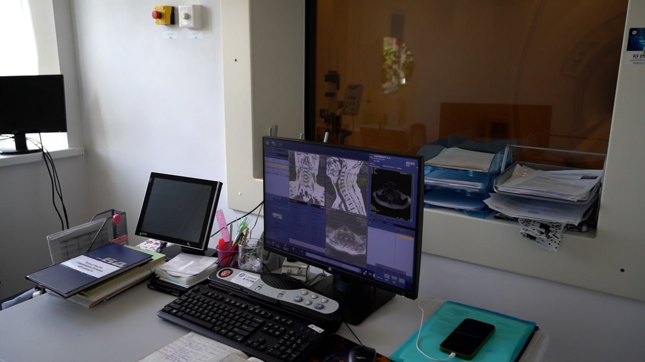 Был осмотрен приемный покой. Заместитель главного врача по лечебной части Марат Девришбеков рассказал о новых технологиях, применяемых в лечении. Он упомянул аппарат МРТ с мощностью 1,5 тесла, способный визуализировать патологические образования малых размеров, которые неразличимы при обследованиях на менее мощных томографах. Марат Девришбеков также подчеркнул, что данный аппарат востребован в онкологии, так как позволяет выявлять образования на ранних стадиях.