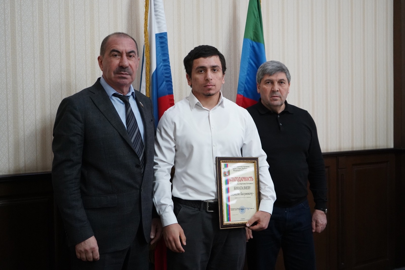 За достигнутые спортивные достижения Благодарность Собрания депутатов вручена студенту филиала ДГУ в г. Дербенте Шамилю Бинаталиеву, серебряному призёру первенства России по тяжёлой атлетике.