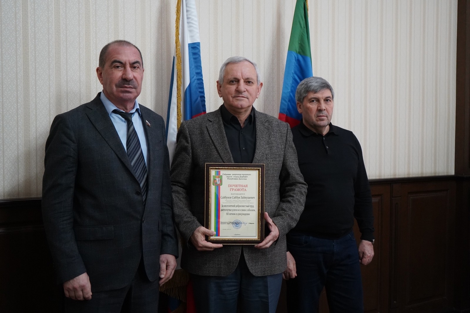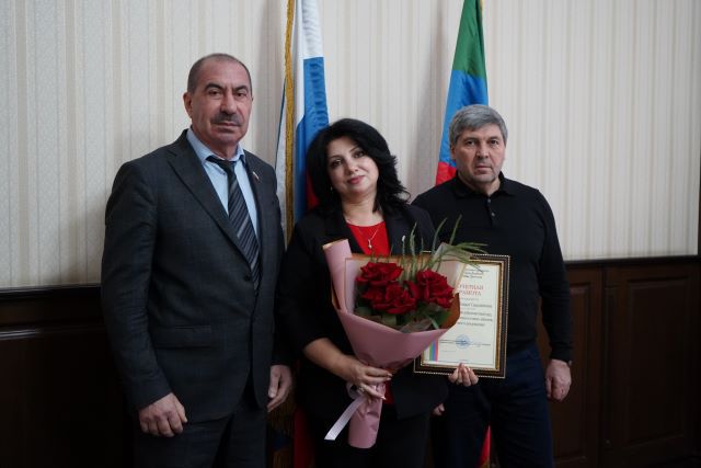 Почётная грамота Собрания депутатов за многолетний добросовестный труд, достигнутые успехи и в связи с юбилеем вручена: начальнику МКУ «Управление по делам гражданской обороны, предупреждению и ликвидации чрезвычайных ситуаций, обеспечению пожарной безопасности» Сайбуну Сайбунову и директору МБУ «Дворец детского и юношеского творчества», отличнику образования РД, Почётному работнику РФ в сфере воспитания детей и молодёжи Заидат Мазановой.